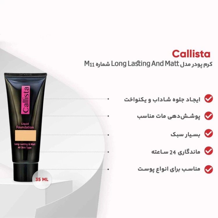 کرم پودر کالیستا مدل Long Lasting And Matt شماره M11 که در حجم 35 میلی لیتر ارائه میشود، فاقد چربی بوده و برای پوست روشن و چرب است. بعد از استفاده از این کرم پودر هیچ گونه احساس برق افتادگی روی پوست خود نخواهید کرد زیرا جلوهای مات دارد. استفاده از این کرم پودر منافذ پوستی شما را مسدود نمیکند و در برابر تعریق مقاوم است. این محصول با توجه به ماندگاری 24 ساعته، نیازی به تمدید در طول روز ندارد. کرم پودر بلکونته یک کرم پودر ایدهآل بوده و بافت نرم و سبک آن پوست شما را طبیعیتر جلوه خواهد داد. همچنین این کرم پودر با داشتن SPF مناسب از پوست شما در برابر اشعههای مضر خورشیدی نیز محافظت میکند.